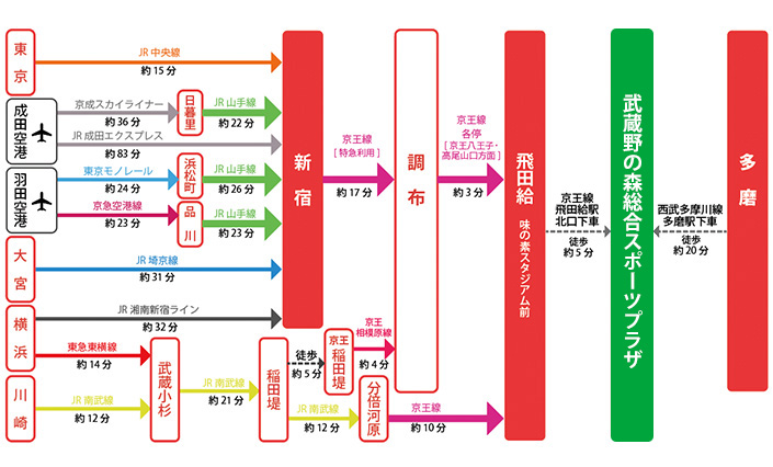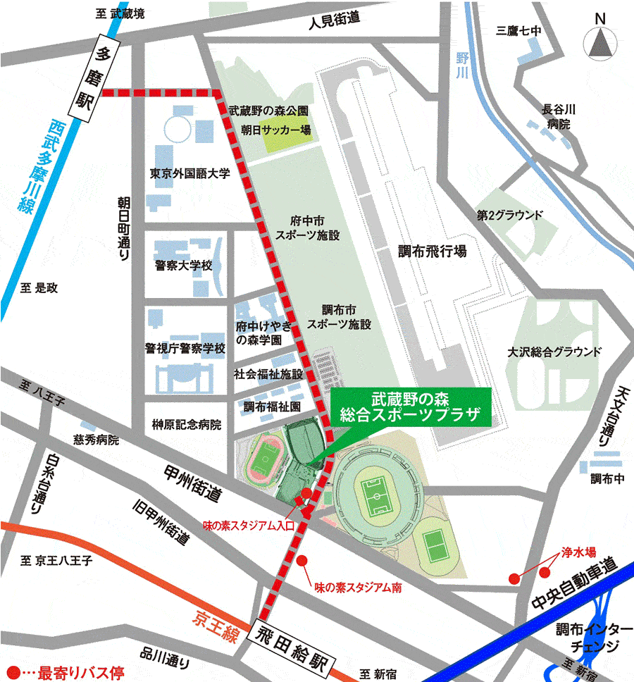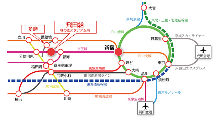 ※콘서트, 대규모 스포츠 대회 등 이벤트가 열리는 날에는 일부 게이오선(京王線) 특급 열차가 도비타큐(飛田給) 역에 임시 정차할 수 있습니다.